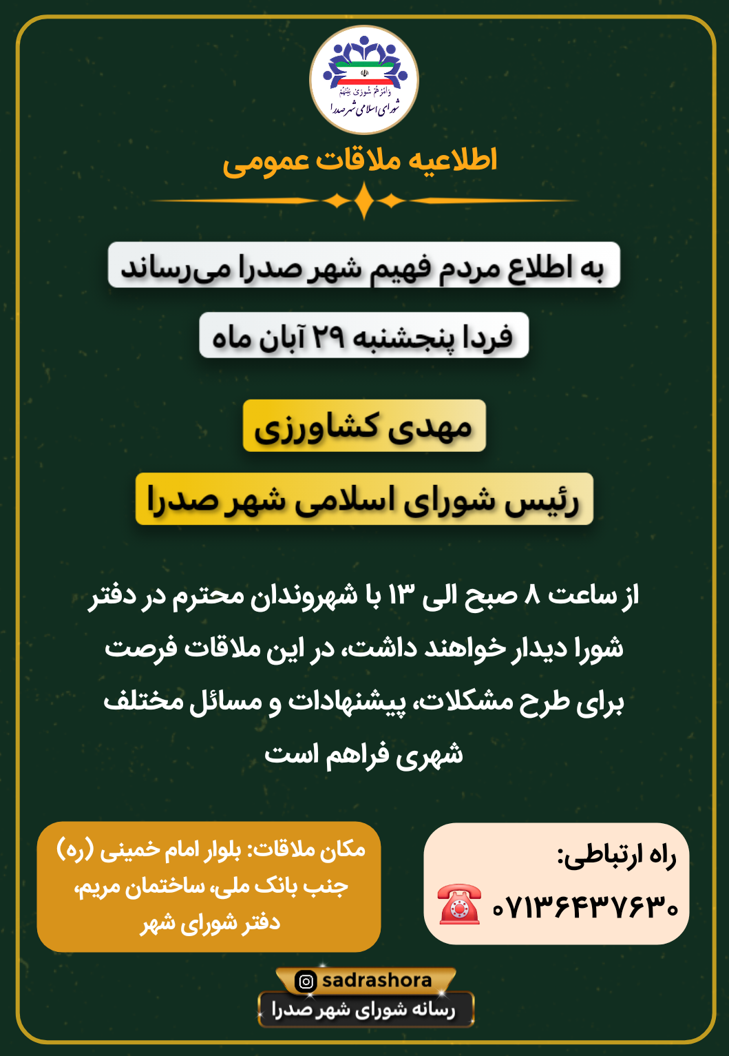 فردا پنجشنبه ۲۹ آبان ماه، مهدی کشاورزی رئیس شورای اسلامی شهر صدرا ، از ساعت ۸ صبح الی ۱۳ با شهروندان محترم در دفتر شورا دیدار خواهند داشت، در این ملاقات فرصت برای طرح مشکلات، پیشنهادات و مسائل مختلف شهری فراهم است
