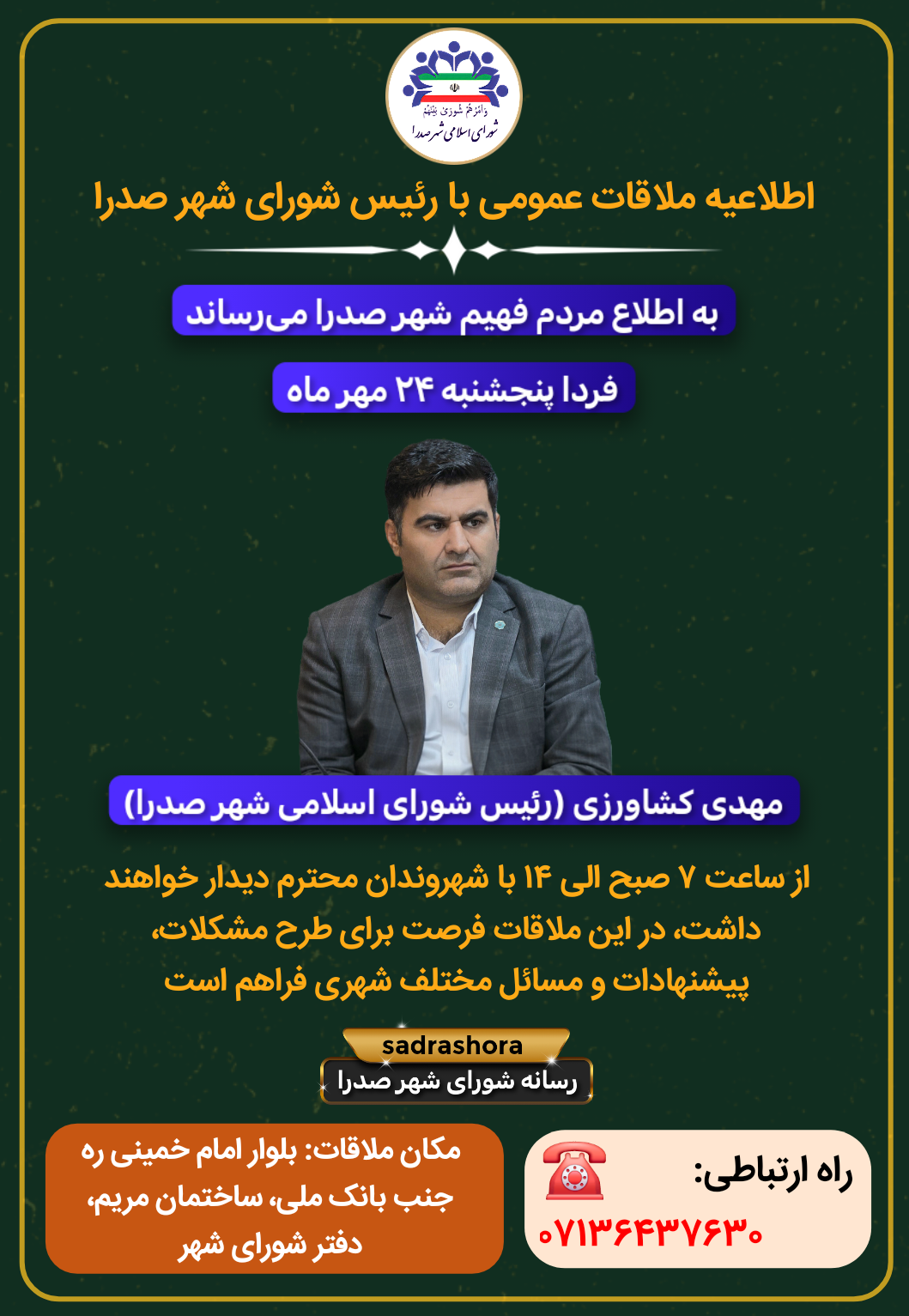 مکان ملاقات: بلوار امام خمینی ره جنب بانک ملی،ساختمان مریم، دفتر شورای شهر